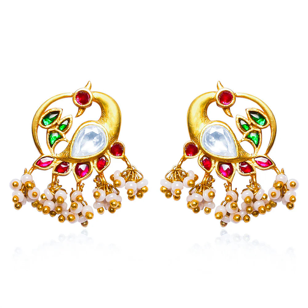 These 92.5 sterling silver stud earrings feature a finely crafted peacock motif inspired by traditional Indian kundan design. The intricate detailing highlights the elegance of the peacock, while the genuine sterling silver ensures durability and hypoallergenic comfort. Ideal for adding a touch of cultural sophistication to any ensemble, these earrings combine timeless craftsmanship with a contemporary appeal. Perfect for special occasions or daily wear, they exemplify expert artistry in traditional jewelry making.