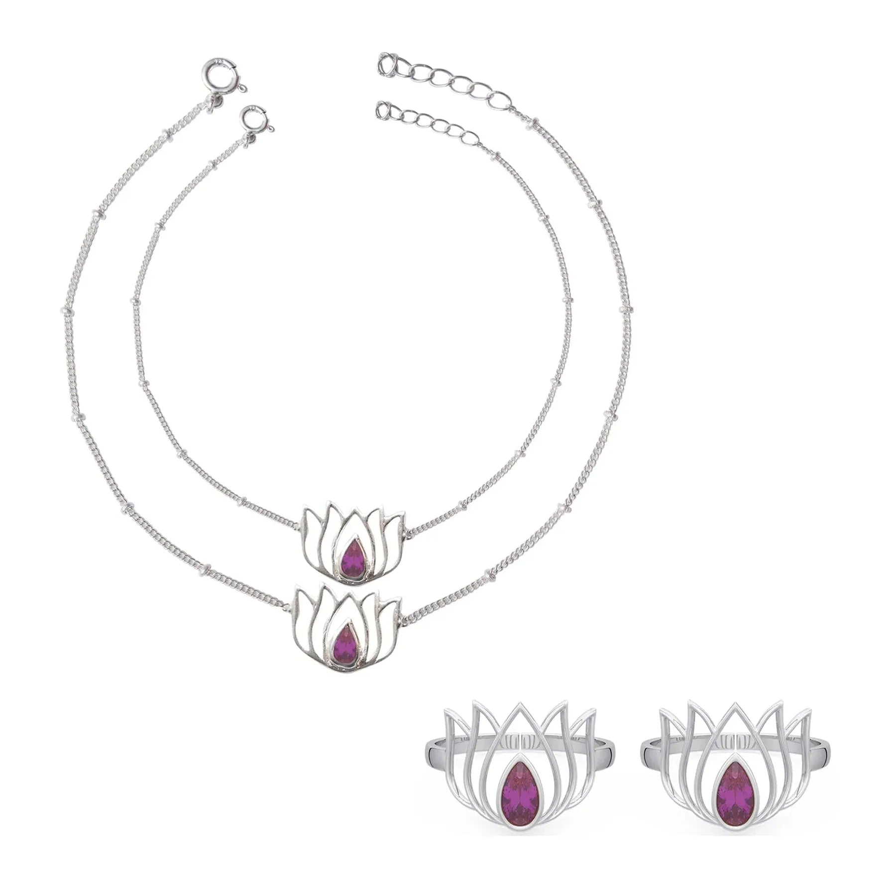 92.5 Sterling Silver Lotus Toe ring with Pink Stone Anklet Set